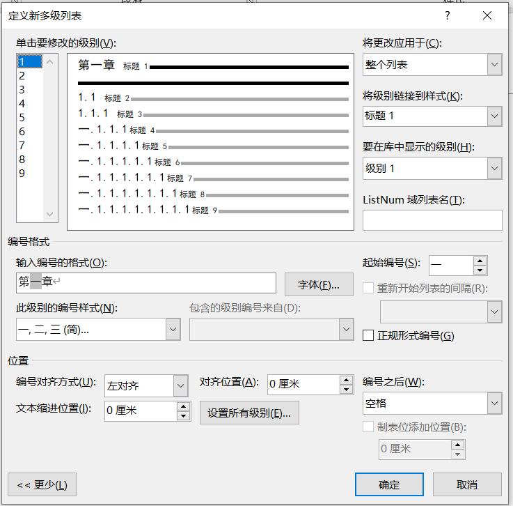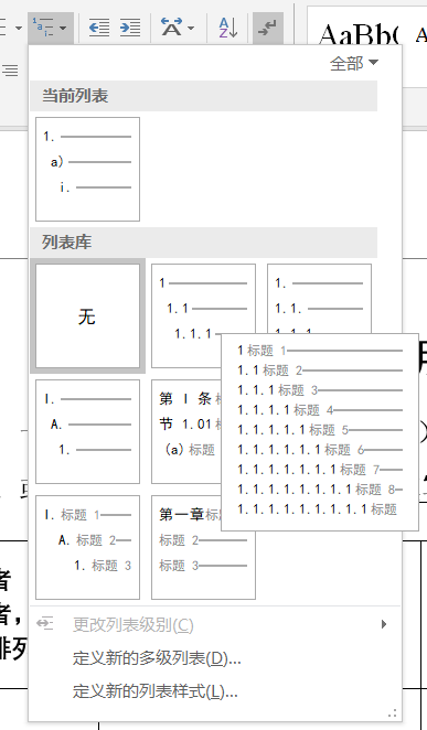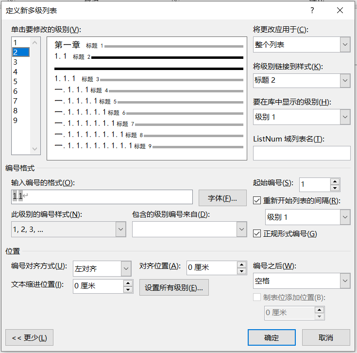 选择多级列表里与标题绑定的列表,可自动为多级标题编号(默认的编号形式:1.1.1)